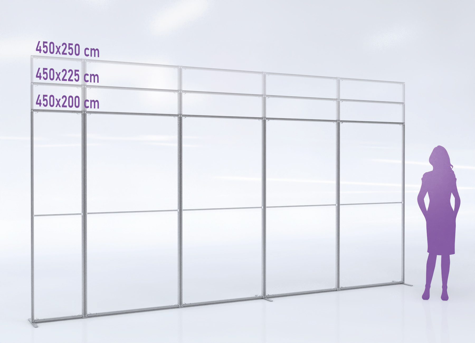 Avec son format 450 cm de large, ce mur d’image est idéal pour habiller un espace, structurer une zone d’accueil ou mettre en valeur une identité de marque sur un salon. Vous profitez d’une surface de communication très généreuse, parfaitement adaptée aux visuels recto/verso pour maximiser l’impact.